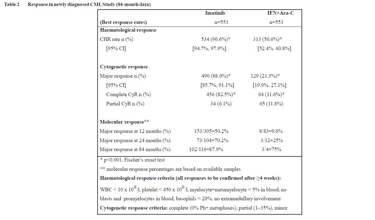 Rates of complete haematological response, major cytogenetic response and complete cytogenetic response on first-line treatment were estimated using the Kaplan-Meier approach, for which non-responses were censored at the date of last examination. Using this approach, the estimated cumulative response rates for first-line treatment with Imatinib improved from 12 months of therapy to 84 months of therapy as follows. CHR from 96.4% to 98.4% and CCyR from 69.5% to 87.2%, respectively.