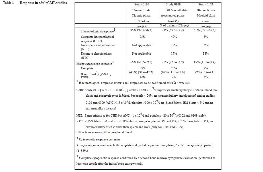 Chronic phase, Interferon failure: 532 adult patients were treated at a starting dose of 400 mg. The patients were distributed in three main categories: haematological failure (29%), cytogenetic failure (35%), or intolerance to interferon (36%). Patients had received a median of 14 months of prior IFN therapy at doses ≥ 25 x 106 IU/week and were all in late chronic phase, with a median time from diagnosis of 32 months. The primary efficacy variable of the study was the rate of major cytogenetic response (complete plus partial response, 0 to 35% Ph+ metaphases in the bone marrow).