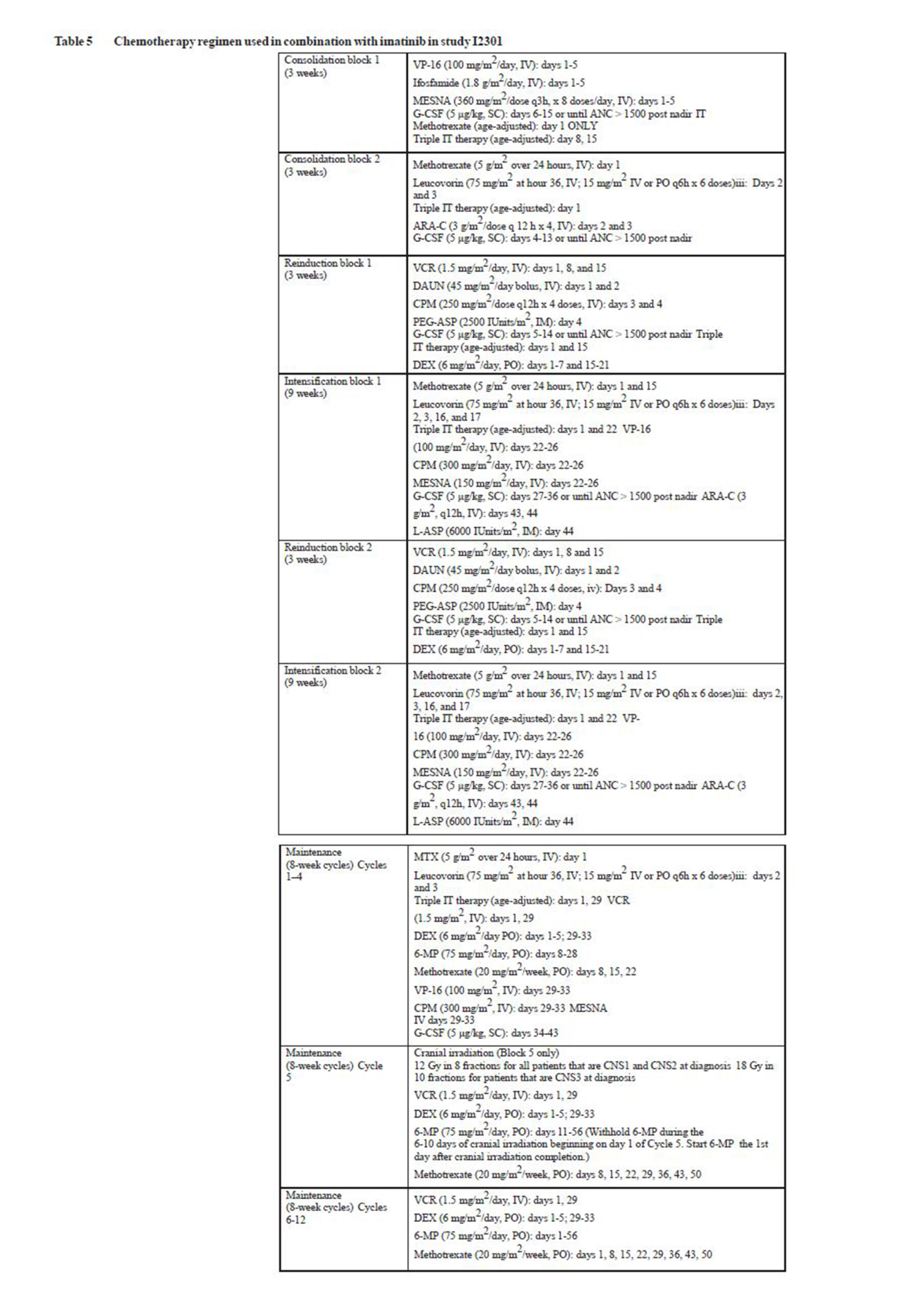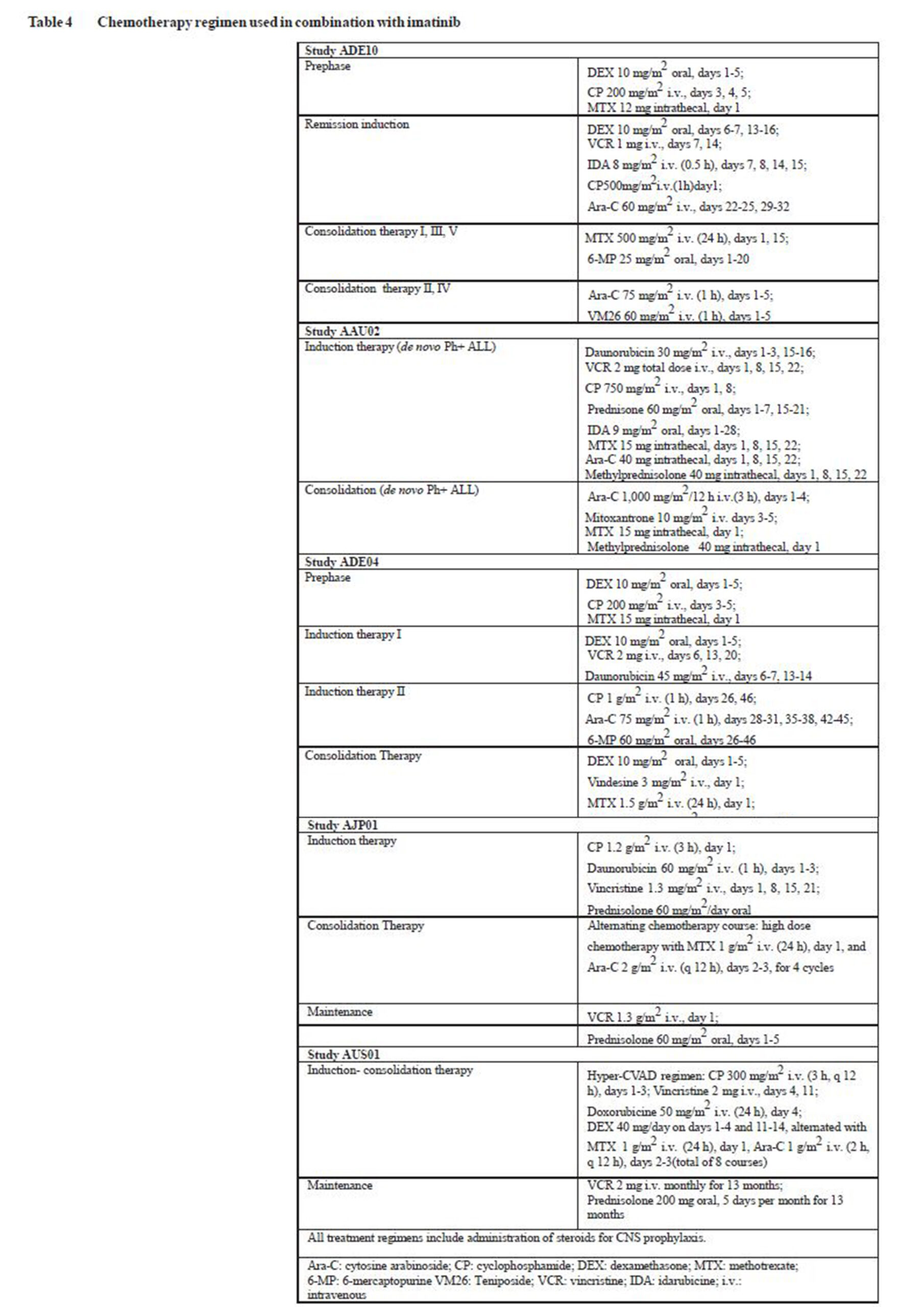 Treatment schedule: On the basis of the existing data, Imatinib has been shown to be effective and safe when administered at 600 mg/day in combination with chemotherapy in the induction phase, the consolidation and maintenance phases of chemotherapy for adult patients with newly diagnosed Ph+ALL. The duration of Imatinib therapy can vary with the treatment programme selected, but generally longer exposures to Imatinib have yielded better results.