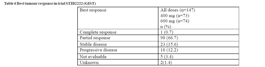 One phase II, open-label, randomised, uncontrolled multinational study was conducted in patients with unresectable or metastatic malignant gastrointestinal stromal tumours (GIST). In this study 147 patients were enrolled and randomised to receive either 400 mg or 600 mg orally once daily for up to 36 months. These patients ranged in age from 18 to 83 years old and had a pathologic diagnosis of Kit-positive malignant GIST that was unresectable and/or metastatic. Immunohistochemistry was routinely performed with Kit antibody (A-4502, rabbit polyclonal antiserum, 1:100; DAKO Corporation, Carpinteria, CA) according to analysis by an avidin-biotin-peroxidase complex method after antigen retrieval.