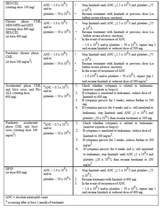 If elevations in bilirubin > 3 x institutional upper limit of normal (IULN) or in liver transaminases > 5 x IULN occur, Imatinib should be withheld until bilirubin levels have returned to < 1.5 x IULN and transaminase levels to <2.5 x IULN. Treatment with Imatinib may then be continued at a reduced daily dose. In adults the dose should be reduced from 400 to 300 mg or from 600 to 400 mg, or from 800 mg to 600 mg, and in children from 340 to 260 mg/m2/day.