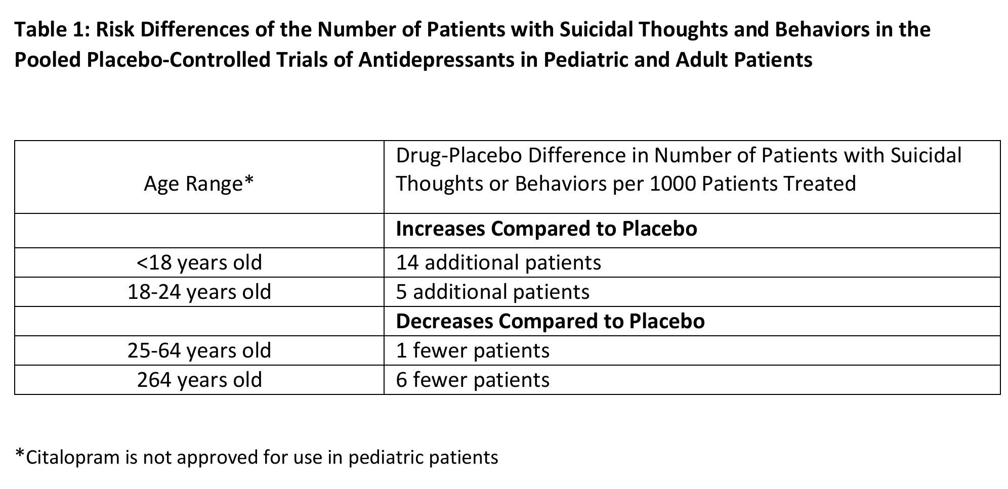 In pooled analyses of placebo-controlled trials of antidepressant drugs (SSRIs and other antidepressant classes) that included approximately 77,000 adult patients, and 4,500 pediatric patients, the incidence of suicidal thoughts and behaviors in antidepressant-treated patients age 24 years and younger was greater than in placebo-treated patients. There was considerable variation in risk of suicidal thoughts and behaviors among drugs, but there was an increased risk identified in young patients for most drugs studied. There were differences in absolute risk of suicidal thoughts and behaviors across the different indications, with the highest incidence in patients with MDD. The drug-placebo differences in the number of cases of suicidal thoughts and behaviors per 1000 patients treated are provided in Table 1.