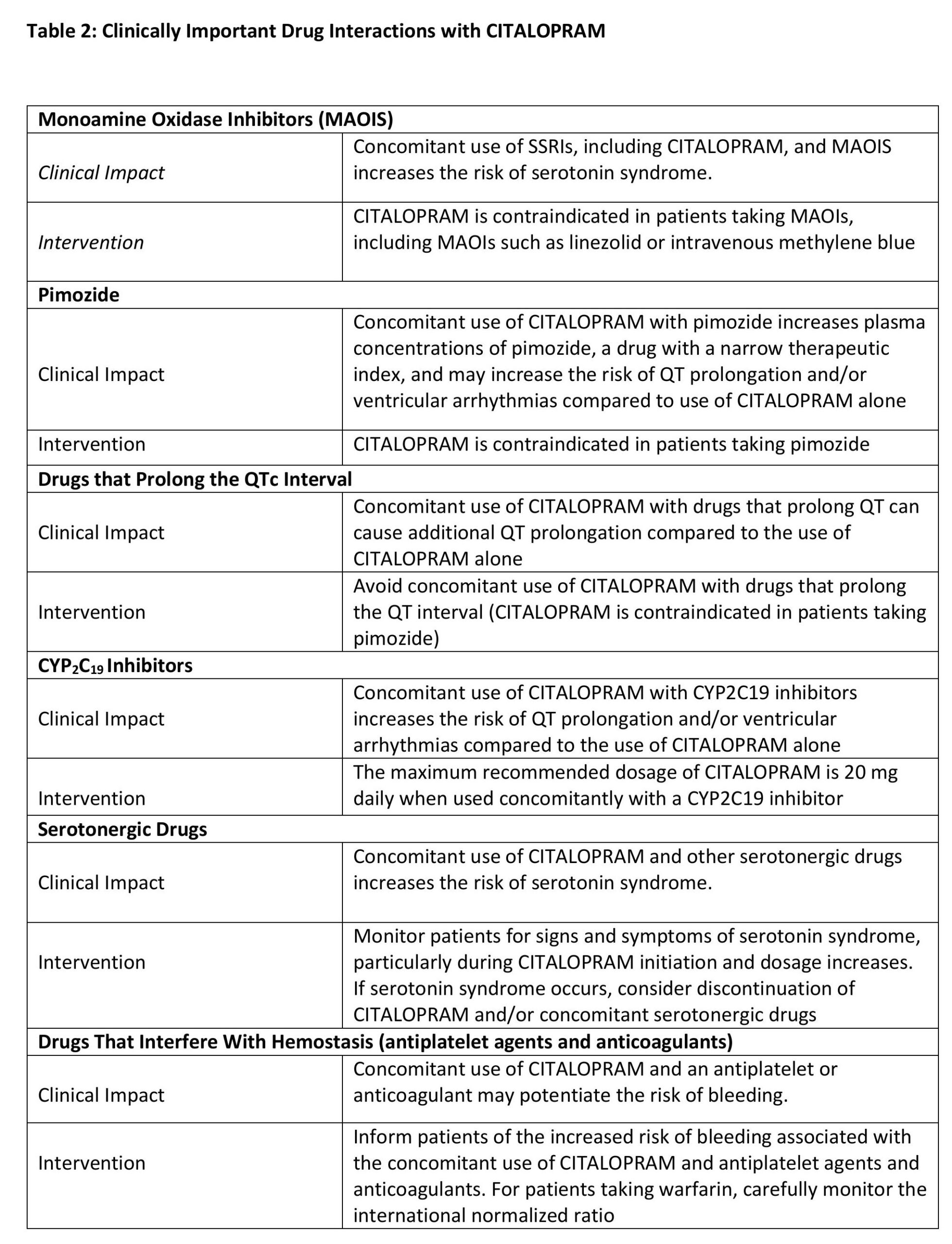Table 2 presents clinically important drug interactions with CITALOPRAM.